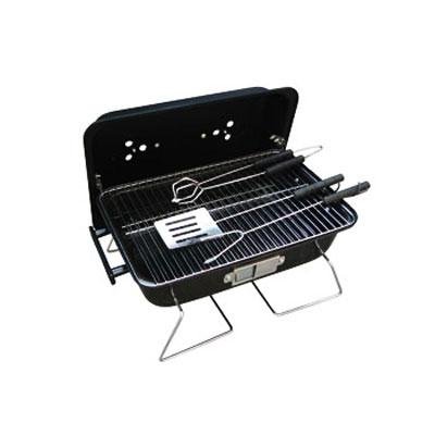 16" x 11" portable charcoal BBQ grill is great for camping, tailgating or any outdoor event; this grill is made of rigid steel and has two layers of baked on paint; Comes equipped with three grill utensils.